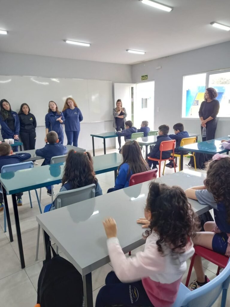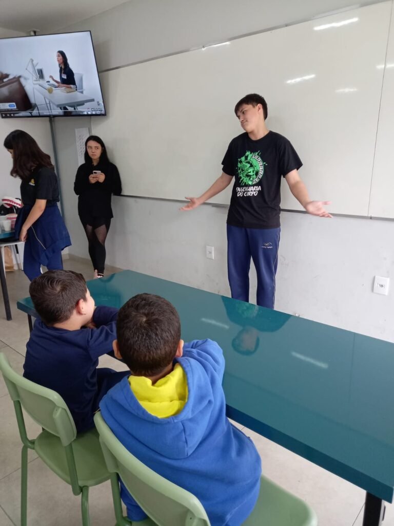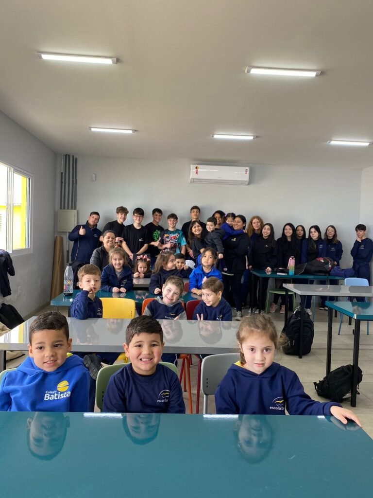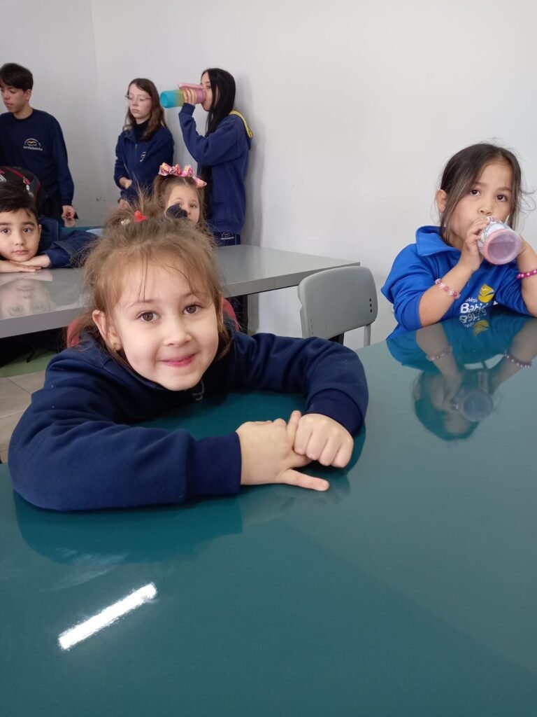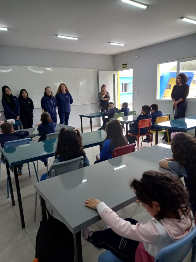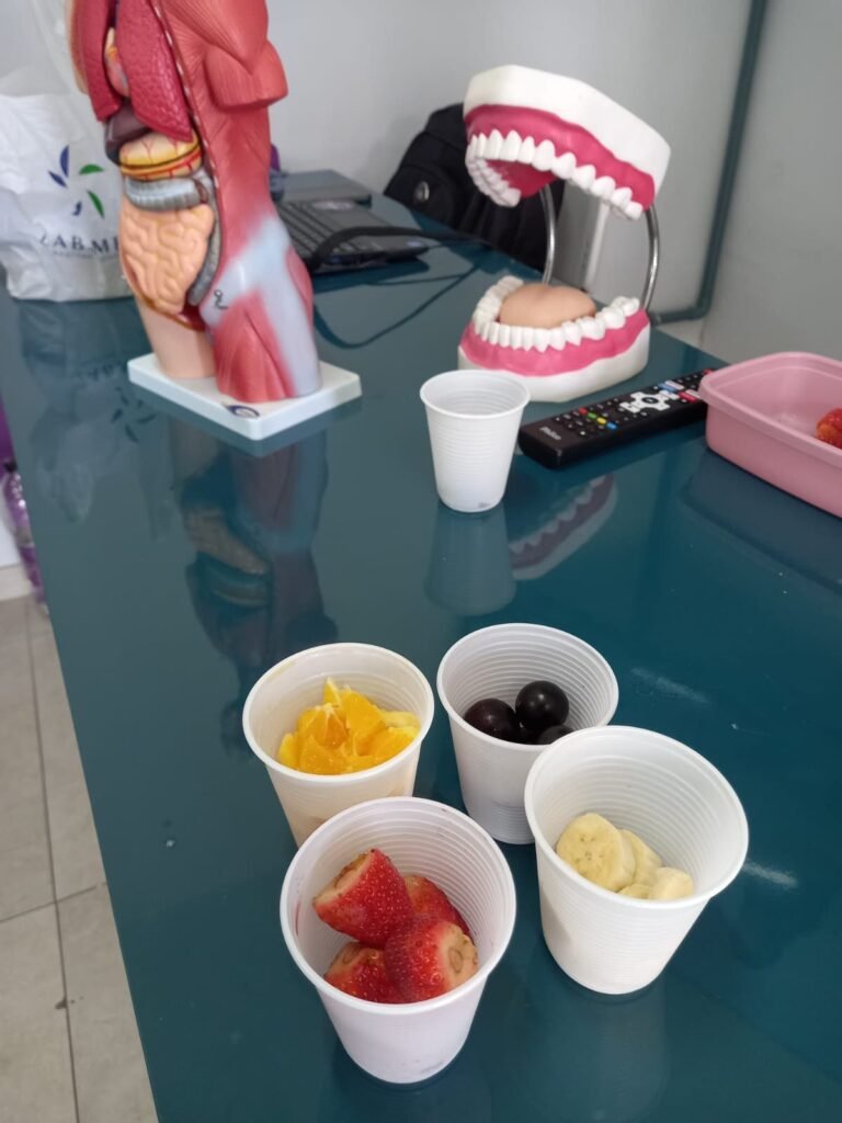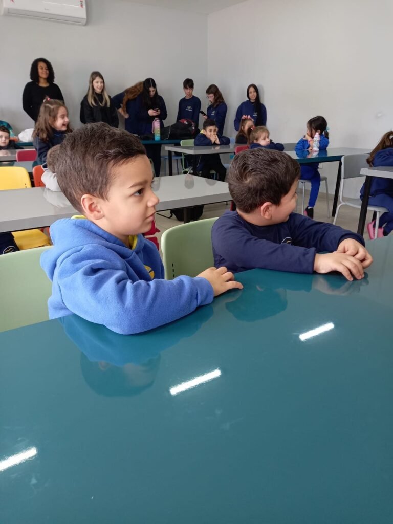 As turmas da Educação Infantil participaram de uma atividade organizada pelos estudantes do Ensino Médio. No Itinerário Biodiversidade e Saúde, sob orientação da professora Leandra, os educandos da turma M10 falaram sobre alimentação saudável e como manter uma boa saúde. Os pequenos ouviram atentamente e participaram, interagindo e experimentando diferentes tipos de frutas.