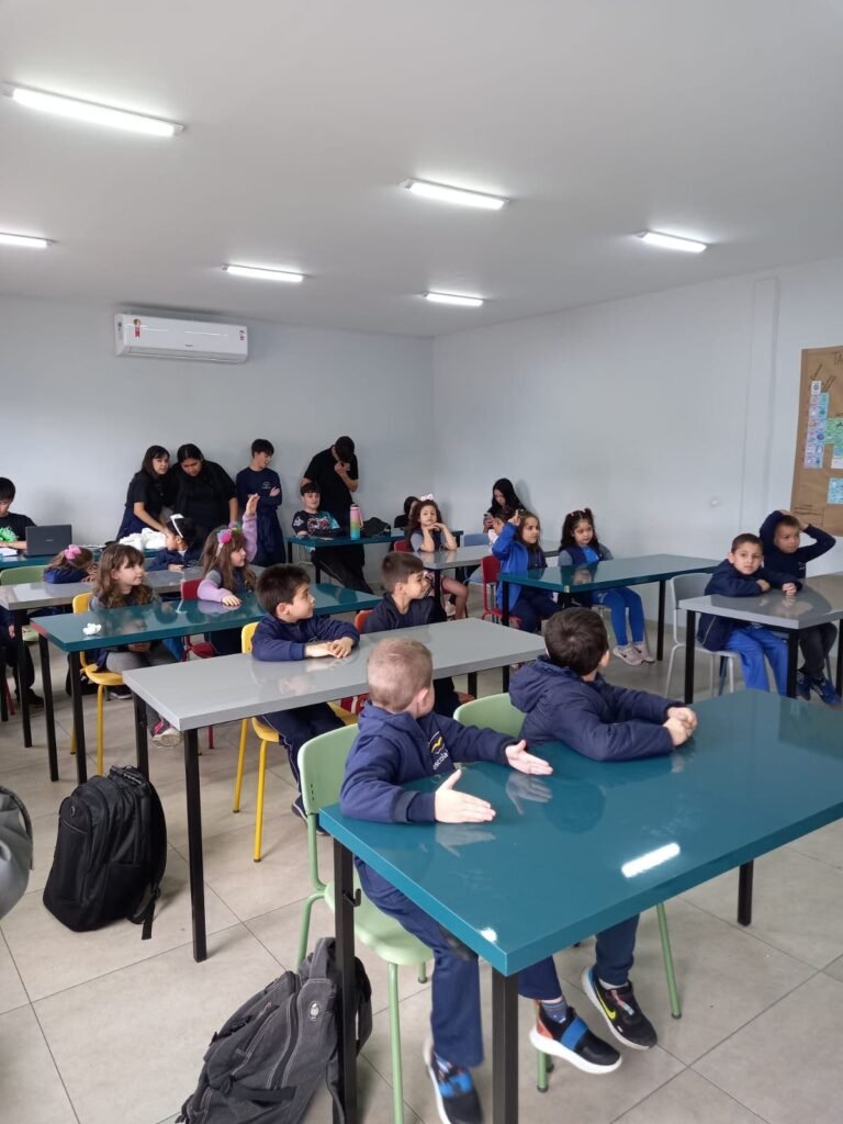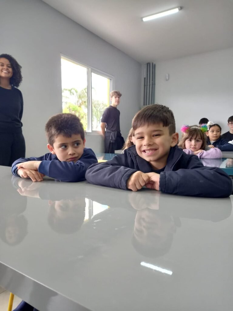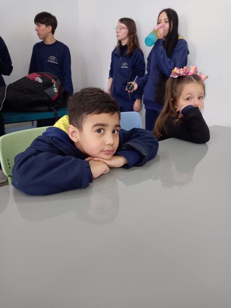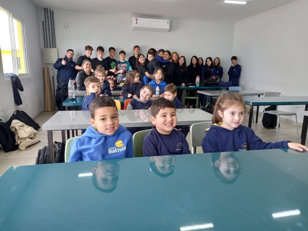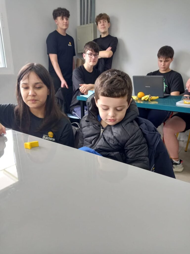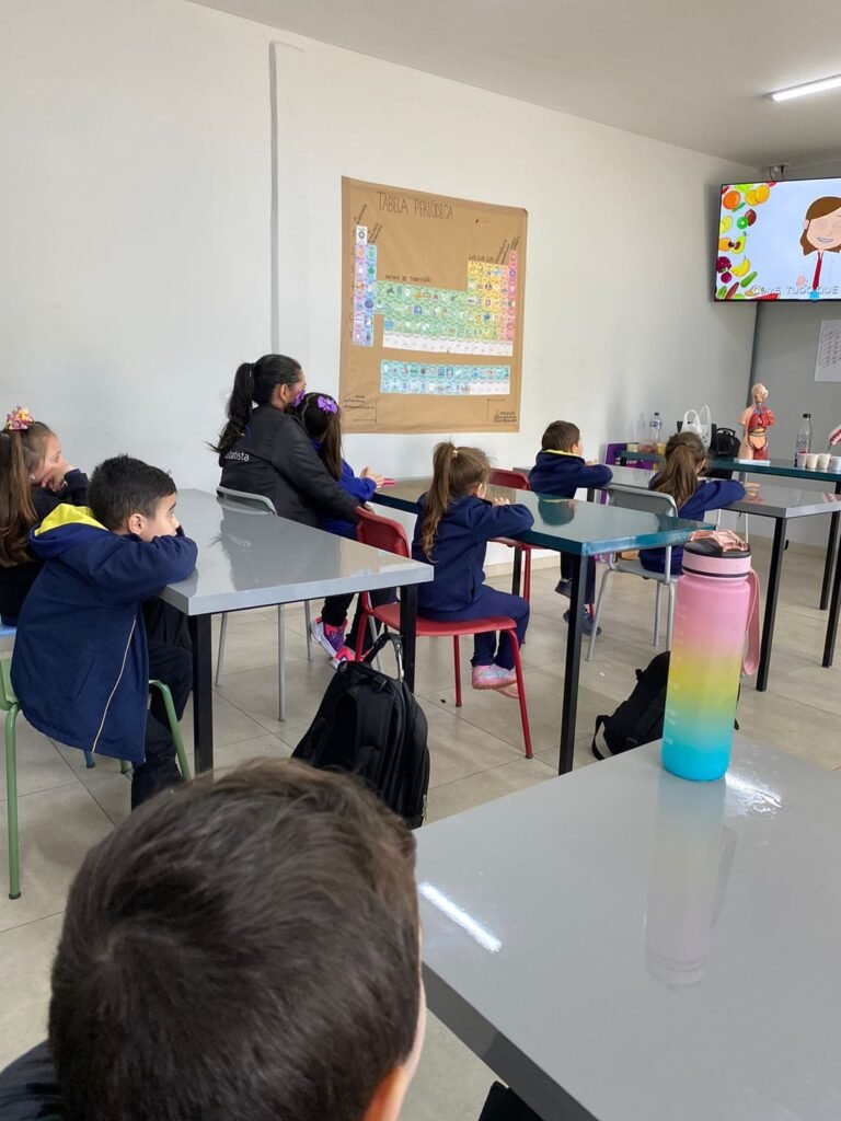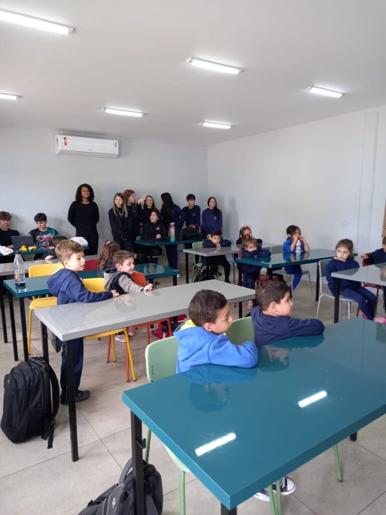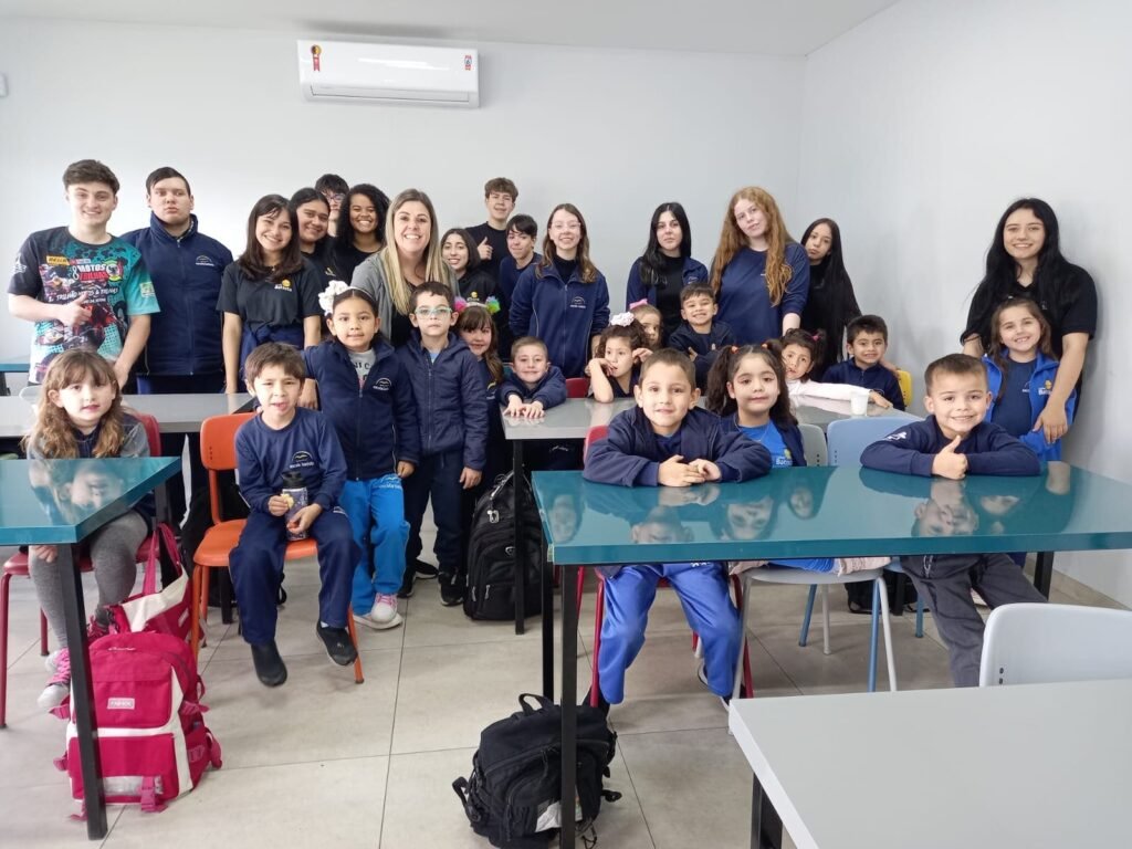 As turmas da Educação Infantil participaram de uma atividade organizada pelos estudantes do Ensino Médio. No Itinerário Biodiversidade e Saúde, sob orientação da professora Leandra, os educandos da turma M10 falaram sobre alimentação saudável e como manter uma boa saúde. Os pequenos ouviram atentamente e participaram, interagindo e experimentando diferentes tipos de frutas.