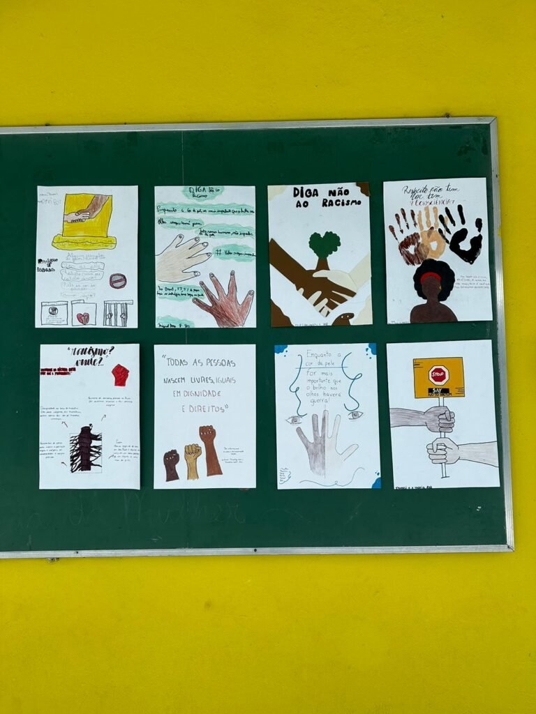Para fazer referência ao Dia Internacional pela Eliminação da Discriminação Racial, os alunos produziram cartazes com frases e informações sobre a temática. As produções ficaram sob responsabilidade das professoras Léia e Monize. No turno da tarde, a professora Bárbara, juntamente com os estudantes da turma 502, também participaram da proposta.