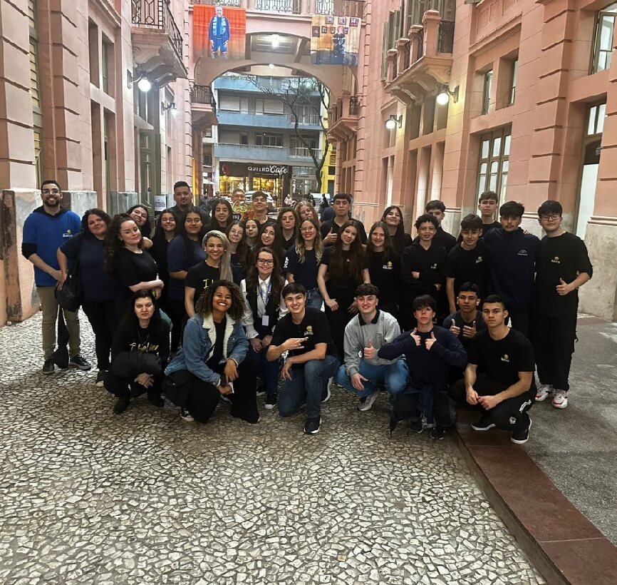 As turmas M10 e M20, do Ensino Médio, fizeram uma viagem de estudos à Porto Alegre, juntamente com os professores Elisandra, Erick, Leandra, Monize e Vitor. O passeio foi destinado a conhecer o Museu Tecnológico da PUC e a Casa de Cultura Mário Quintana.
